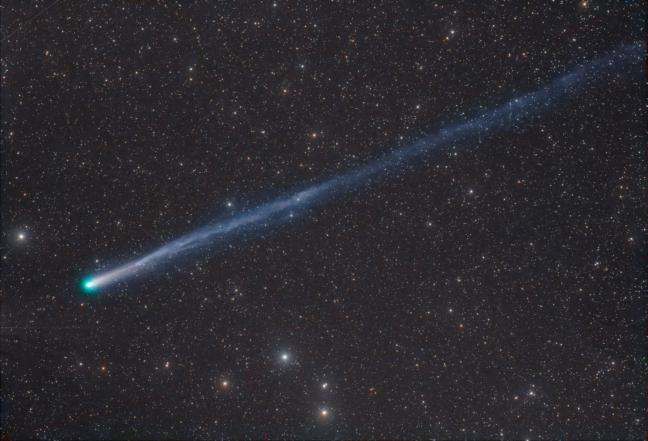 Actuellement visible à l’œil nu dans le ciel du matin, la comète Lemmon est en train de déployer une impressionnante queue de gaz. Elle a été photographiée ici par Michaël Jager et Gerald Rhemann le 3 octobre 2025 avec un simple petit téléobjectif de 135 mm. Les nombreuses photos de ce duo de photographes spécialistes des comètes la montrent étendue sur plus de 12°, ce qui est immense ! À titre de comparaison, la largeur de la Grande Ourse est de 20° environ. Ou encore si on compare la largeur apparente de Lemmon à la Pleine Lune, elle est 25 fois plus étendue !