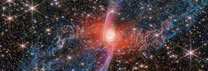 Sous l'oeil infrarouge du télescope spatial James Webb, la nébuleuse de l'Araignée Rouge (NGC 6537) se révèle toute en dentelles. Son étoile centrale serait double, soupçonnent les astronomes.