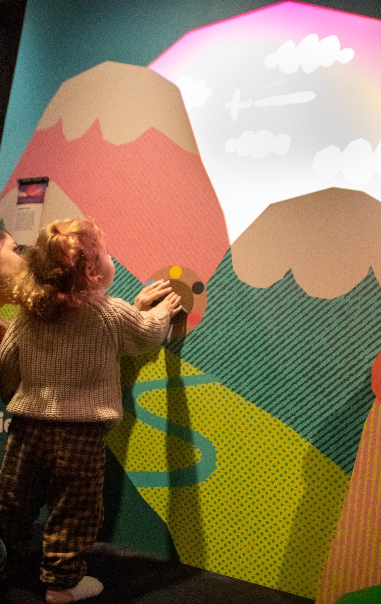 Cette première initiation au ciel et à l’espace commence de jour, sur notre planète Terre aux couleurs chatoyantes. Ici, les modules en bois médium et aux bords arrondis sont une invitation à la grimpette. Là, des panneaux interactifs s’utilisent sans avoir besoin d’un mode d’emploi. À moins d’un mètre du sol, l’un d’eux recrée les éléments de notre météo terrienne. D’un coup de manivelle, le vent se met à souffler dans les têtes blondes ; des flocons tombent dans une grosse boule à neige ; un éclair jaillit à chaque saut de cabri sur une planche. Plus loin, tourner une grosse aiguille sur son cadran donne au ciel ses différentes teintes : rouge, bleue, noire…