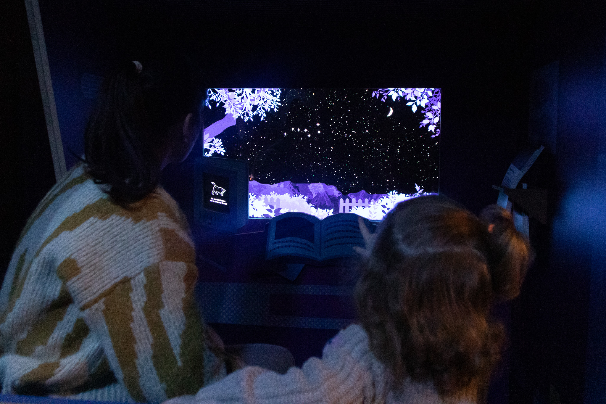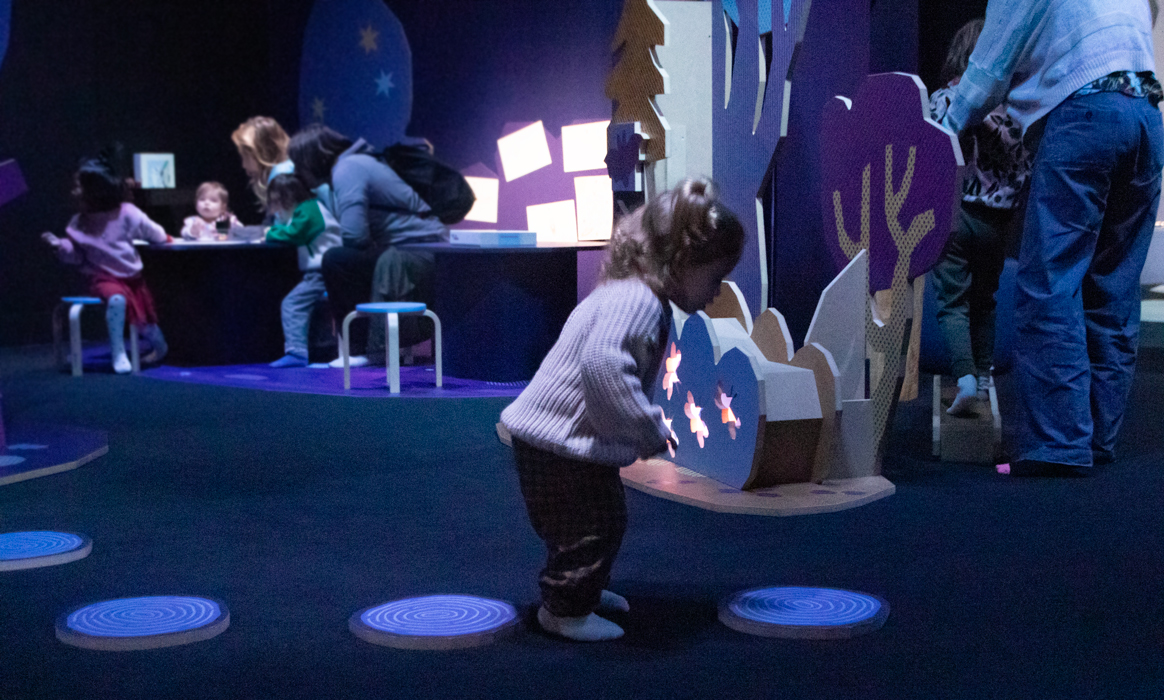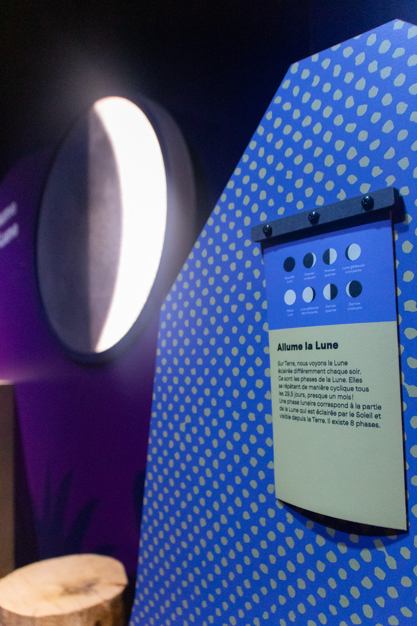 C’est dans la nuit que se poursuit la visite. Le hululement d’une chouette retentit à la lueur d’une Pleine Lune, dont le limbe s’observe par l’oculaire d’un petit télescope (un Dobson de 76 mm de diamètre). Dans une cabine pouvant accueillir un enfant et un adulte, l’un des seuls écrans de l’exposition montre un ciel étoilé tournant lentement. Les lumières qu’il est bon de savoir reconnaitre y apparaissent tour à tour : l’ISS, un satellite, un avion, la Grande Ourse, une étoile filante… Mais cet espace initiatique à l’astronomie ne serait pas complet sans un Système solaire, ni une grosse lune sous laquelle aiguille et cadran servent cette fois-ci à en allumer les différentes phases. « Ici, nous prévoyons des ateliers de médiation scientifique », indique Aurélie Linxe, responsable du pôle des exposition du musée de l’Air et de l’Espace.
