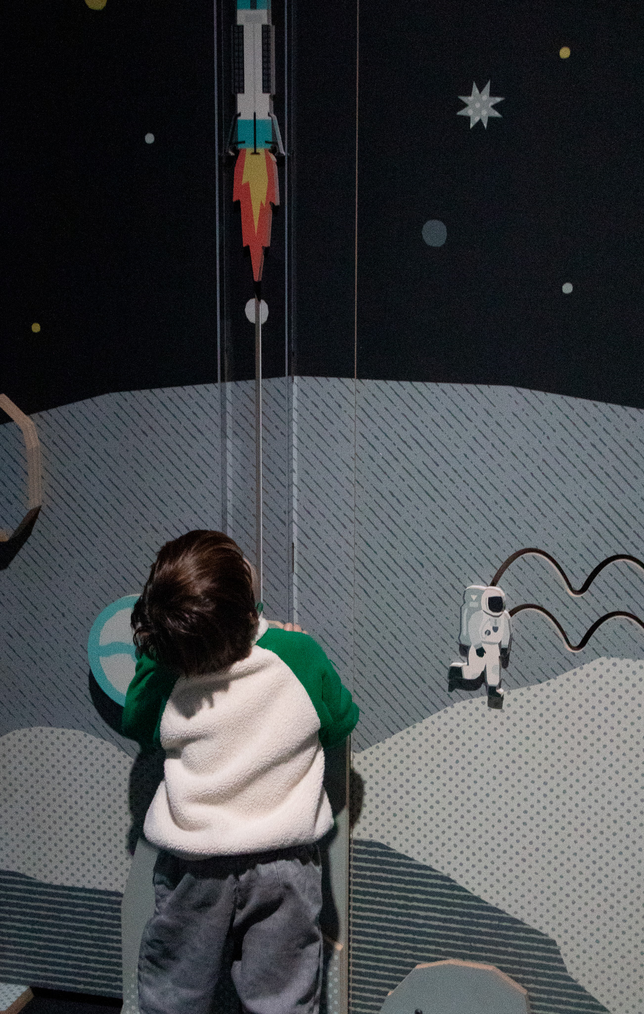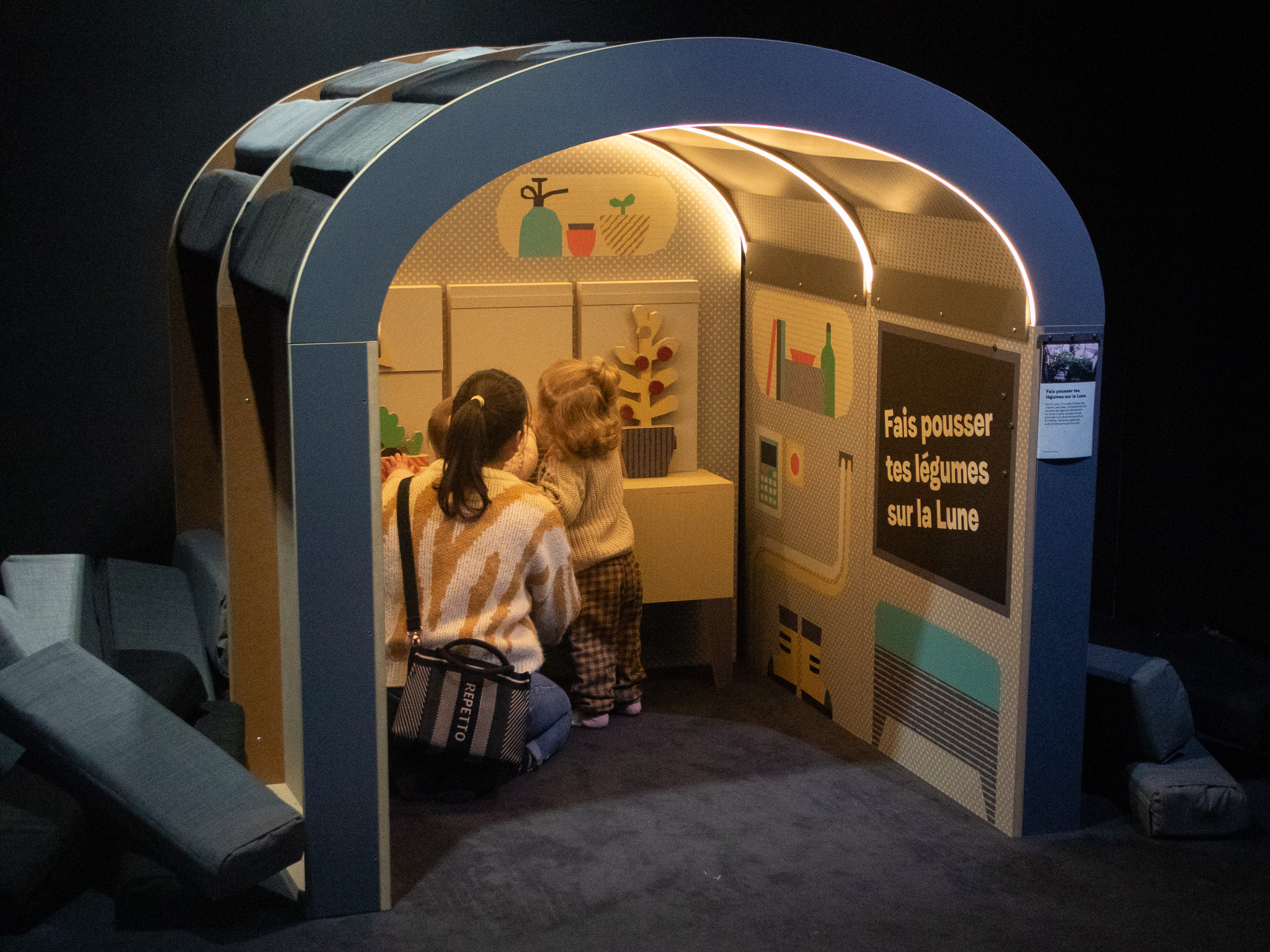 Non loin, une fusée cartoonesque dont le moteur gronde bel et bien cherche son équipage. Les graines d’astronautes accèdent en y grimpant au dernier grand espace de l’expo. Celui de l’exploration de la Lune. Passé un mural sur lequel s’actionnent différents engins lunaires, une cabane à l’allure de serre abrite une dinette pour astronautes. En haut d’un petit pont, un trampoline à taille réduite permet de s’affranchir, un peu, de la pesanteur. Le tout sous le regard d’un scaphandre grandeur nature debout derrière sa vitre. Une autre combinaison spatiale ayant davantage l’allure d’un déguisement peut être décorée à souhait avec différents patchs.